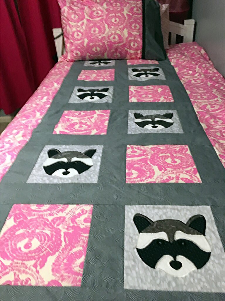 I was commissioned by Michelle to create a duvet cover for her daughter. After speaking with Michelle, she informed me her daughter loves pink and racoons (she calls them garbage pandas)! Michelle sent me this picture of the duvet cover on her bed.